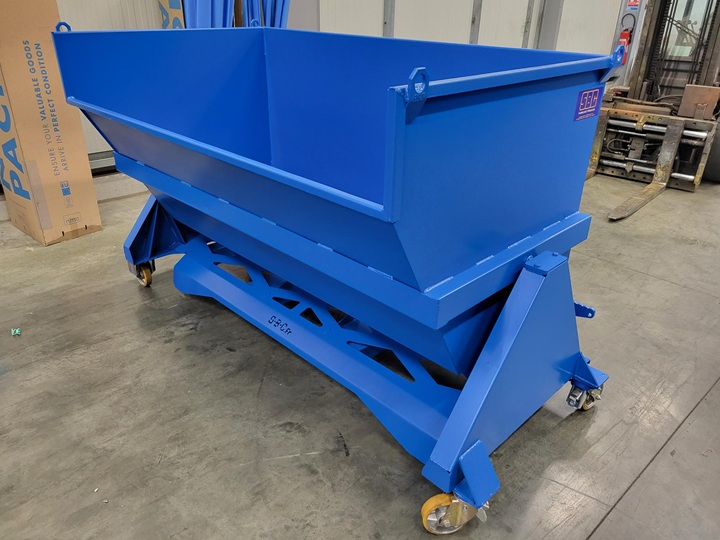 - Cuve mécano-soudée en tôle ép. 3 mm articulée sur axe renforcé de Ø 35 mm.